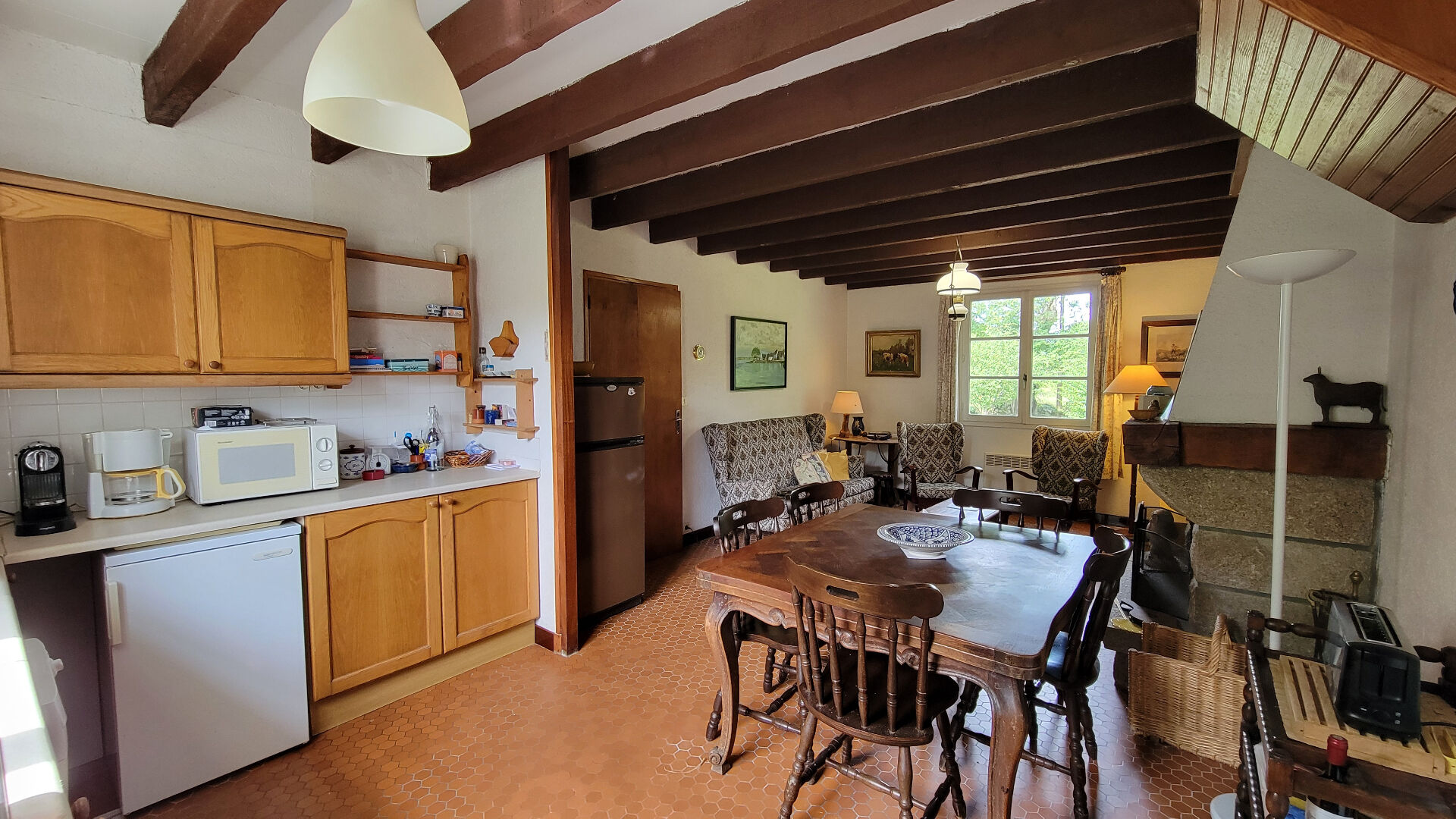 La pièce de vie, traversante d'Est en Ouest comprend une cheminée avec foyer ouvert et donne sur une terrasse couverte exposée Sud.