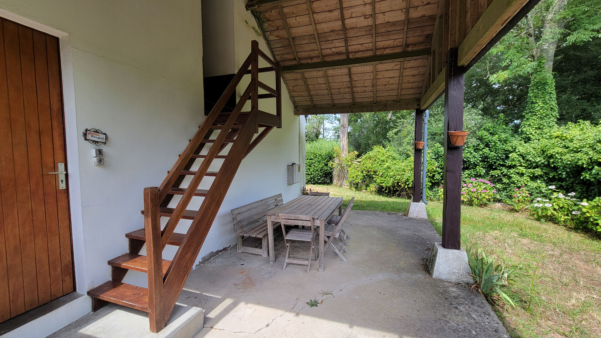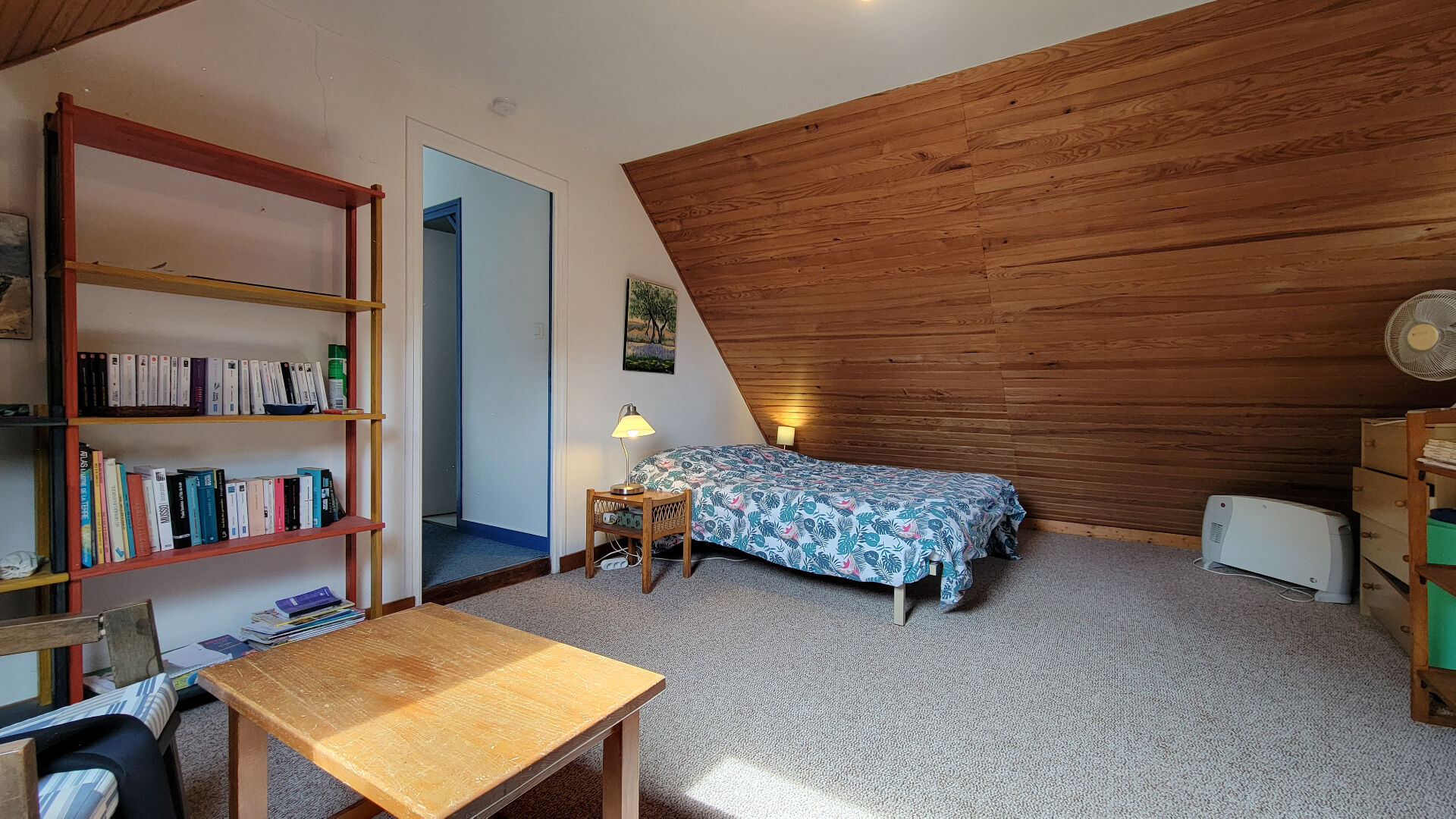 Depuis la terrasse couverte, on accès à l'étage par un escalier extérieur. L'étage comprend une grande pièce pouvant servir de dortoir ou pouvant être aménagée en pièce de vie et un couloir dessert une chambre , une salle d'eau, un WC indépendant et un petit débarras.